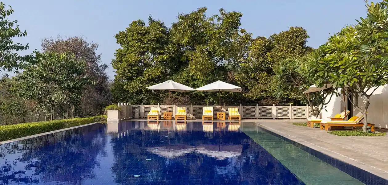 The accommodation at The Oberoi Sukhvilas is truly remarkable. Guests have the option to select from luxurious rooms, cozy tents, or spacious villas, many of which come with their own private swimming pools and beautifully landscaped gardens. Each area beautifully blends traditional Indian design with modern luxury, featuring elegant marble bathrooms, handcrafted furniture, and breathtaking views of the lush forest surrounding the property.